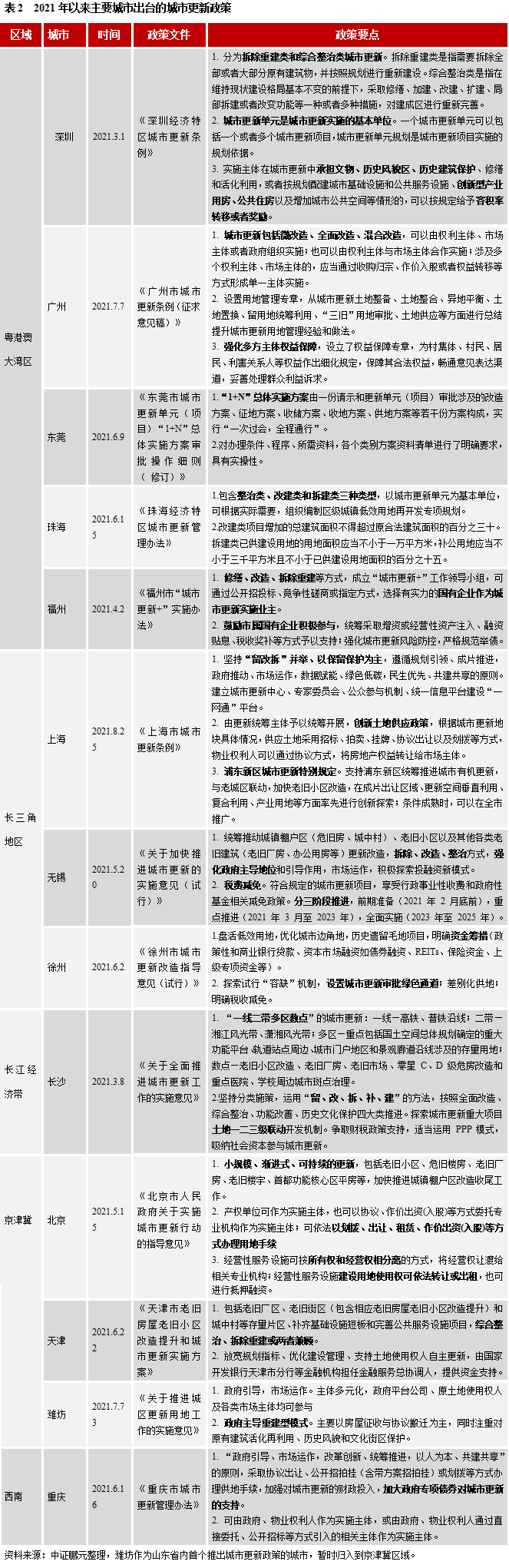 1.國家層面政策推動,城市更新上升到國家戰(zhàn)略。2021年,城市更新首次被寫入政府工作報告,并列入《十四個五年規(guī)劃和2035年遠景目標綱要》,各地積極響應(yīng),迅速出臺了一大批城市更新政策和實施計劃。截止目前,據(jù)不完全統(tǒng)計,2021年全國絕大多數(shù)省市層面均提出城市更新,13個地級城市發(fā)布了城市更新相關(guān)政策。其中深圳和上海完成了城市更新立法,廣州城市更新立法正在征求意見中。北京、成都、上海、天津、武漢、無錫等地陸續(xù)成立或準備組建城市更新公司和基金,在政策帶動下,城市更新發(fā)展迅猛。