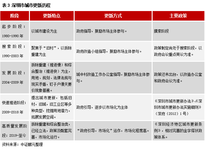 與國外主要發(fā)達城市相比,城市更新演變歷程相似,我國城市更新也大體分四個階段:萌芽、起步、探索、提速。萌芽階段以增加居住、生活空間為主,滿足基本的居住空間需要;起步階段以經(jīng)濟建設(shè)為主,進行大規(guī)模的拆除重建;探索階段開始注重人文環(huán)境、城市功能改造,這時期以棚改、城中村改造為主,試點探索局部范圍改造,拆除重建仍占據(jù)較大比例;提速階段注重高質(zhì)量發(fā)展,減少拆除重建,進行可持續(xù)發(fā)展的城市更新。我國城市更新推廣發(fā)展離不開深圳、廣州、上海等地的示范效應(yīng)和傳導(dǎo)作用,具體來看看四個一線城市更新歷程和特點。