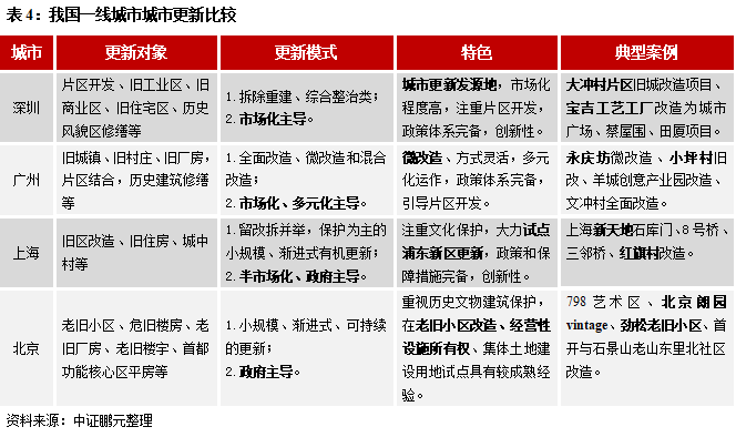(3)更新方式與對象大同小異。更新方式上無論是留改拆,還是綜合整治與拆除重建,還是全面改造和微改造,無非是改造力度大小,目前還是減少單個的拆除大改造類別,以連片開發(fā),修補、有機更新為主流。更新對象主要是集中在老舊住宅區(qū)、廠房、商業(yè)、歷史街區(qū)和文化歷史建筑,城市風(fēng)貌和功能方面。