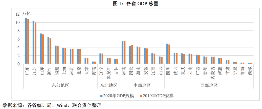 ?GDP總量在經濟相對發達地區和欠發達地區的分化較為明顯,東部地區繼續維持領跑態勢;2020年,除湖北以外,其余30個省份GDP增速全部轉正,中西部地區增速分化更為明顯,東北地區經濟恢復相對較慢,東部地區則相對較為均衡。