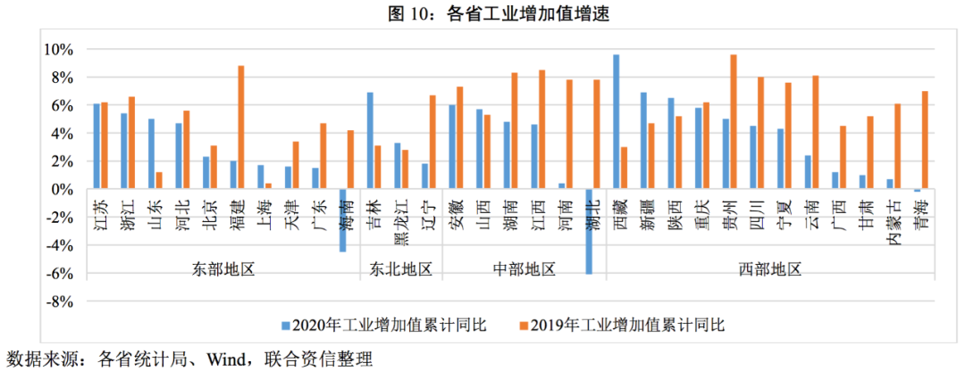 ?工業生產方面,僅青海、海南以及湖北三個省份的工業增加值增速尚未轉正;東部地區工業企業利潤遙遙領先,中部和西部地區次之,東北地區明顯落后;區域內分化程度進一步加劇。