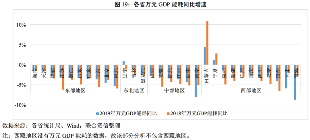分區域看,2019年大部分省份的GDP能耗同比均有所下降,而內蒙古和寧夏連續兩年均為正增長,且內蒙古的增速高達4.49%,遼寧則由2018年的能耗下降轉為2019年的增長。習近平總書記在十九屆五中全會、中央經濟工作會議、中央全面深化改革委員會會議等重要會議多次強調了抓緊制定碳排放達峰與碳中和行動方案,2020年《政府工作報告》規劃了“十四五”期間我國的能源消耗和碳排放工作。上述政策將會對以鋼鐵和石油化工等傳統工業為主的省份,如東三省、河北以及天津等,帶來較大的產業轉型壓力,同時對經濟增長帶來一定的壓力。