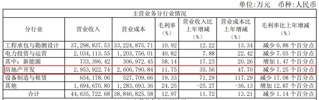2021年報顯示,中國電建房地產板塊營收295.39億元,同比增長35.56%,營業(yè)成本同比增速47.7%高于營收同比增速;毛利率11.75%,同比下降7.25 個百分點;歸母凈利潤7856.28萬元,同比增長74.2%。