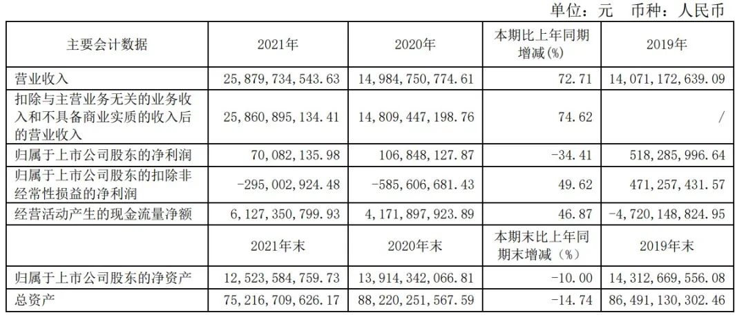 接下來光明地產的營收增速更猛。如下圖年報數(shù)據顯示,2021年營收258.8億元,同比增長72.71%。但歸母凈利潤有點慘,同比下跌了34.41%為7008.2萬元。扣非后的凈利潤為負值,2.95億元,不過比2020年同期的-5.86億元縮窄了一些。