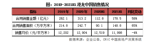 業(yè)績增長超行業(yè)平均,目標完成率51.7%。2021年上半年,港龍中國合約銷售金額178.5億元,同比增長約58%,高于百強房企平均40%的銷售增長率。同期銷售面積148.8萬平方米,同比增長65%。管理層在2020年中期業(yè)績發(fā)布會上表示2021年的銷售目標為345億元,前6月目標完成率51.7%,高于行業(yè)49%的平均水平。