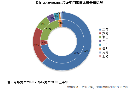長三角銷售額占比91%,安徽省銷售強勁。從銷售金額的分布來看,長三角作為大本營,占比高達91%。江蘇作為發(fā)家地,銷售金額占比雖相比2020年下降了10個百分點,仍達62%。根據(jù)CRIC監(jiān)測的江蘇12個城市榜單來看,企業(yè)只在常熟、常州和宜興3個城市上榜,港龍在未來還需加大本土市場的深耕,省內(nèi)業(yè)績還有提升空間。安徽作為2020年新進省份,銷售強勁,地位替代浙江,銷售額占比相比2020年提升17個百分點至21%,位列第二。其余省份銷售額占比均小于10%,其中廣東和四川同為2020年新進省份,開始貢獻銷售額,占比分別為4%和3%。