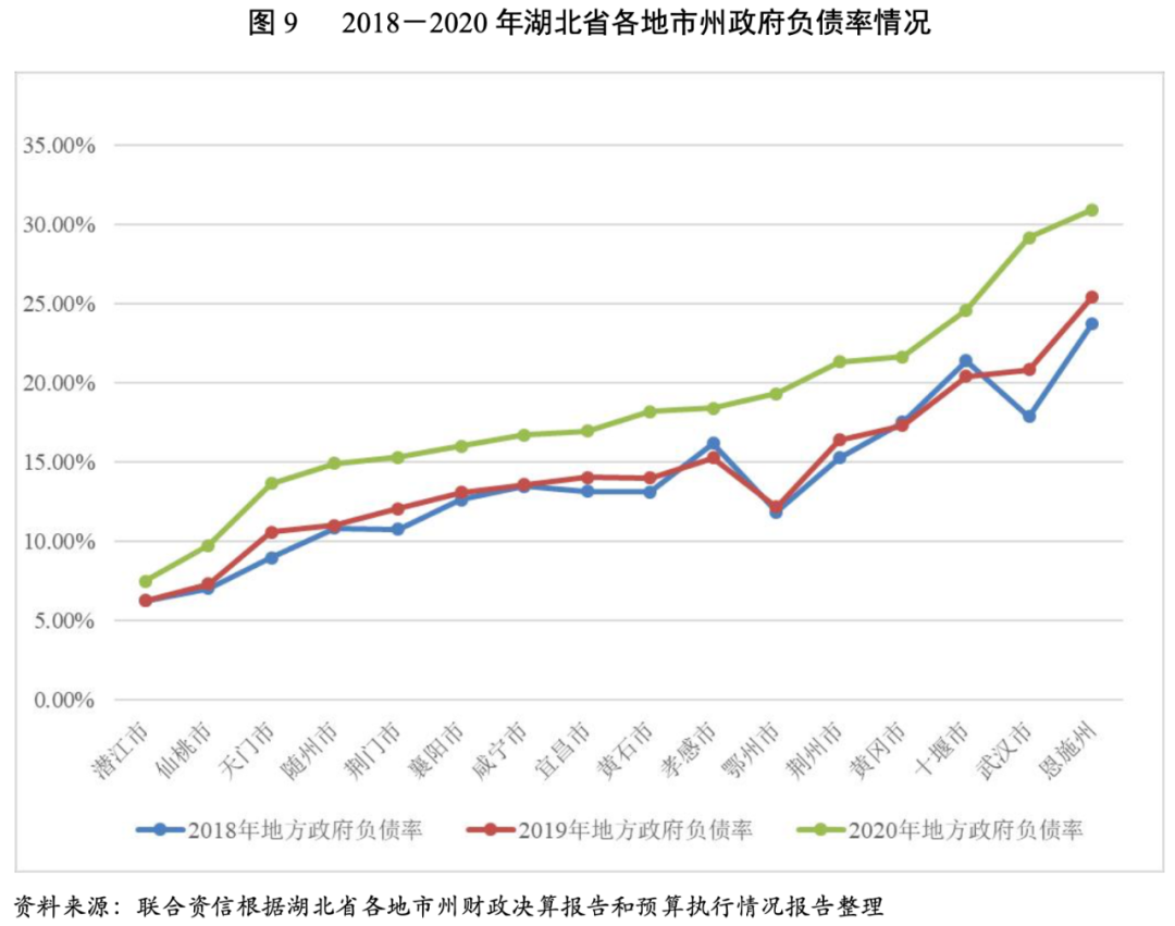 債務(wù)負(fù)擔(dān)方面,2018-2020年,湖北省各地市州政府負(fù)債率基本呈上升態(tài)勢(shì)。2020年,恩施州政府負(fù)債率在省內(nèi)各地市州中最高,為30.92%,較上年末增長5.49個(gè)百分點(diǎn),武漢市政府負(fù)債率增幅最大,為8.35個(gè)百分點(diǎn)。