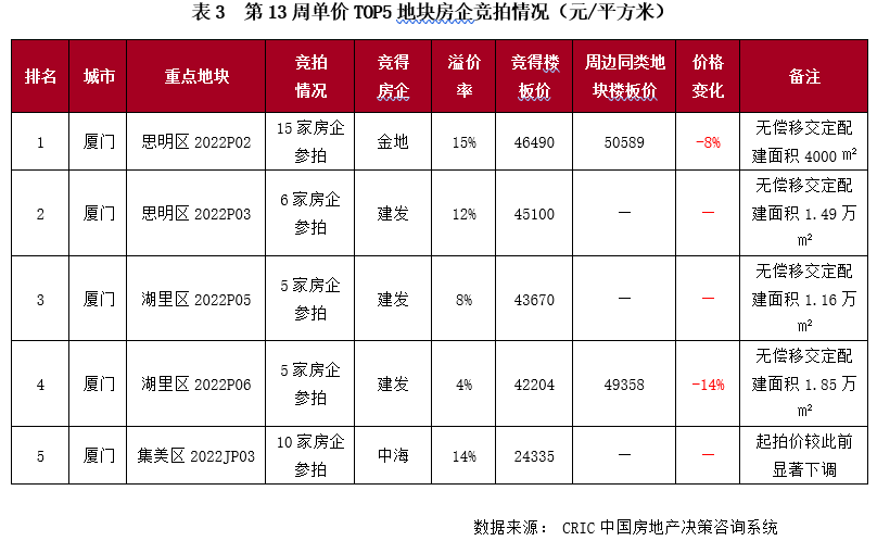 在廈門成交的9幅地塊中,僅有3幅底價成交,其余6宗地全部溢價成交,如單價榜單中入榜的5幅就全部溢價成交。其中思明區P02號地塊、集美區JP03號地塊均吸引了十家及以上的房企參拍,最終均觸頂搖號,由金地和中海分食,成交樓板價分別為46490元/平方米和24335元/平方米。
