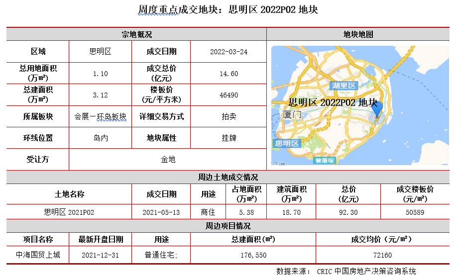 2幅搖號成交地塊中,位于島內的思明嶺兜2022P02地塊競爭更為激烈,共吸引了15家房企競拍,是參拍房企數量最多的地塊。據地理位置來看,地塊緊鄰環島干道,周邊還有環島東路、會展路、呂嶺路等城市主干道,同時地塊還臨近地鐵2號線軟件園二期站,交通出行十分便捷。地塊周邊的生活、教育、醫療等配套同樣十分齊全,附近有軟件園生活廣場、廈門雙十中學思明分校、廈門第二實驗小學分校等豐富配套。目前,地塊周邊在售、待售項目不多,均價約在7.2萬元/平方米,與項目銷售限價接近。除了優越的地理位置外,該地塊之所以受到多家房企的激烈爭奪,主要是在島內出讓地塊中該宗地的起拍總價最低,且配建也相對較少,對房企而言資金壓力較輕,是本輪土拍中外來房企進入島內的最佳選擇。