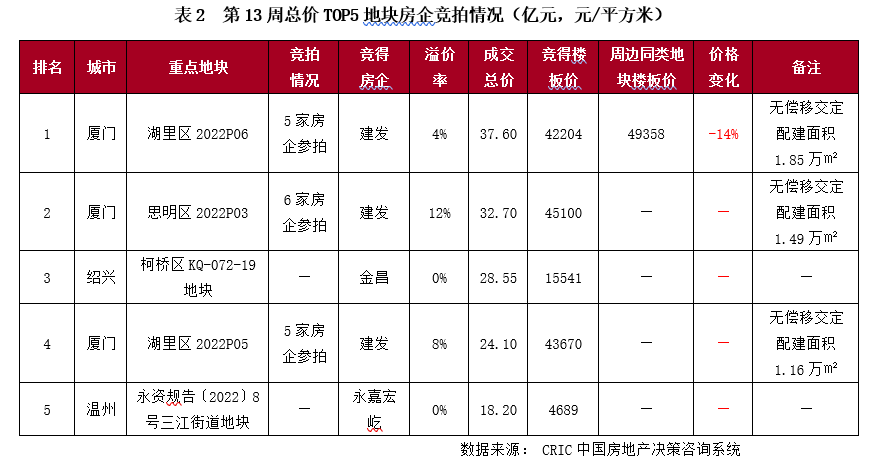 市場熱度方面。由于廈門、合肥本次集中出讓優質用地供應比例大增,并且出讓門檻也較此前降低,因此兩城均出現了地價觸頂成交的現象,首輪土拍的平均溢價率分別達6.78%和11.21%,是已完成土拍城市中平均成交溢價最高的兩個城市。在此帶動下,本周重點監測城市的溢價率也突破5%,回漲至7.7%。