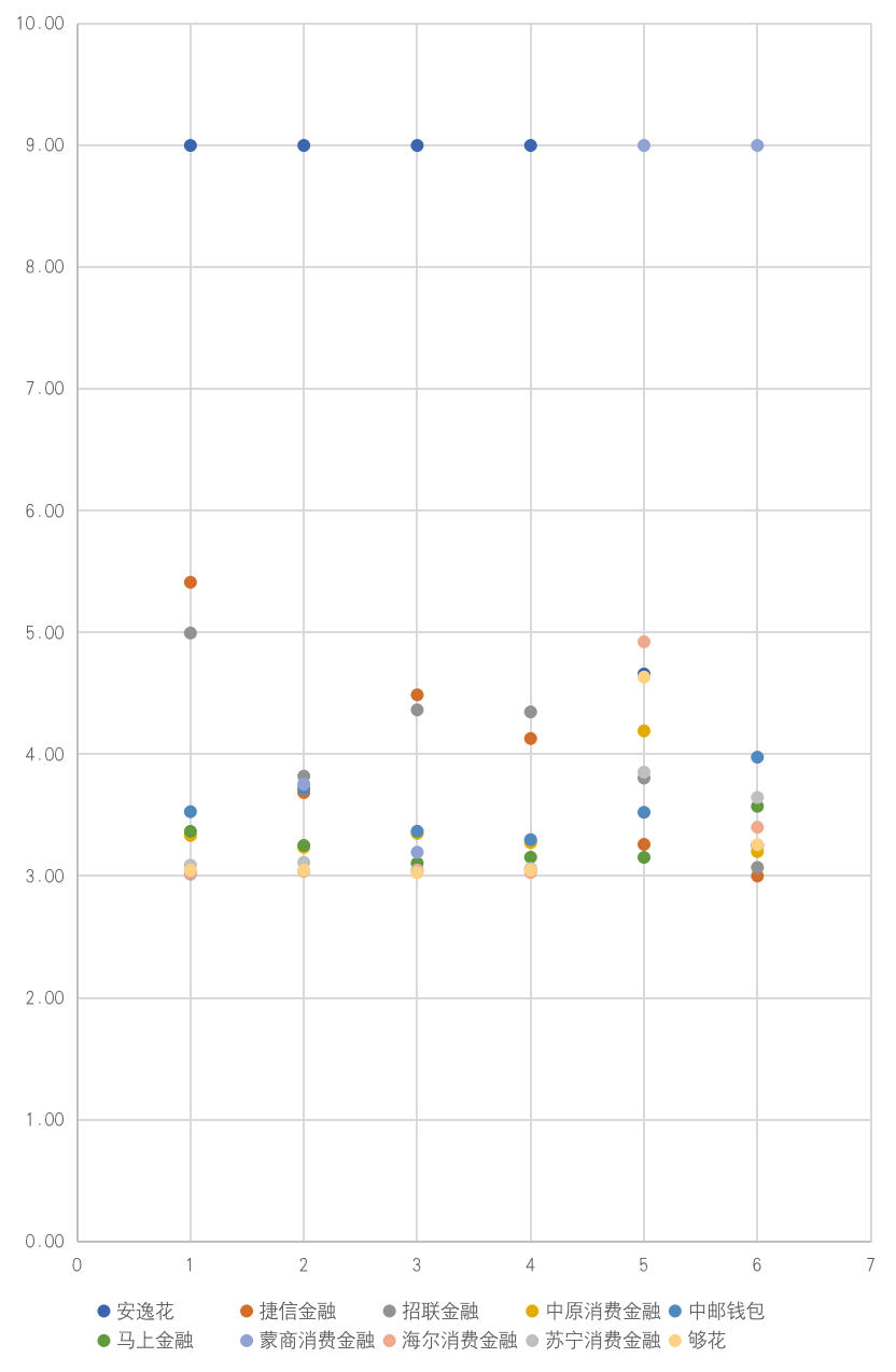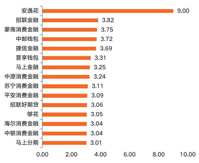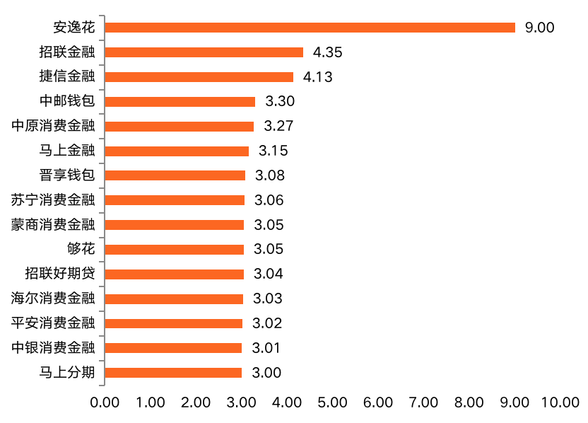 從日均活躍用戶的評分來看,安逸花APP表現最為突出,為9分;招聯金融APP和捷信消費金融APP分別為第二名(4.35分)和捷信消費金融(4.13分),其他消費金融APP均在3分左右。