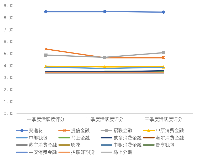 零壹智庫綜合對比15款APP第一二三季度活躍度的評分發現,安逸花、招聯金融、捷信金融APP的地位相對而言較為穩定,始終位于前三。