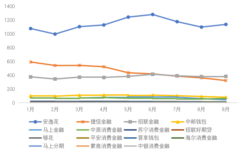 綜合來看,截至2021年第三季度,安逸花、招聯金融、平安消費金融、海爾消費金融和中銀消費金融5款APP的月活躍人數呈上升趨勢。除2月份以外,安逸花APP其他8月均突破了千萬的月活躍人數。捷信金融、中郵錢包、馬上金融、中原消費金融、蘇寧消費金融、招聯好期貸、夠花、晉享錢包、馬上分期和蒙商消費金融10款APP呈下降趨勢。