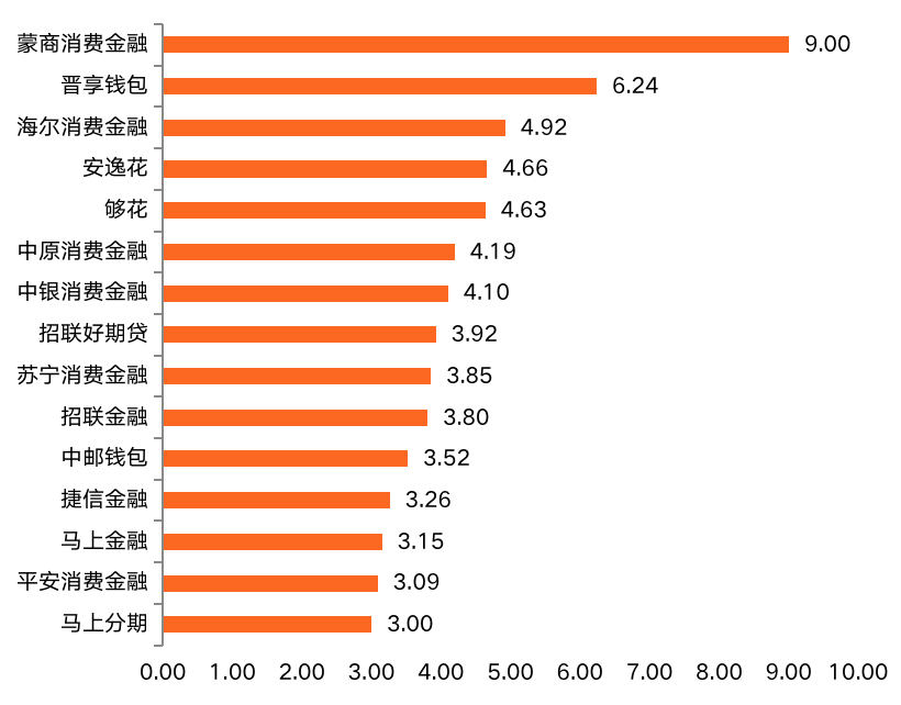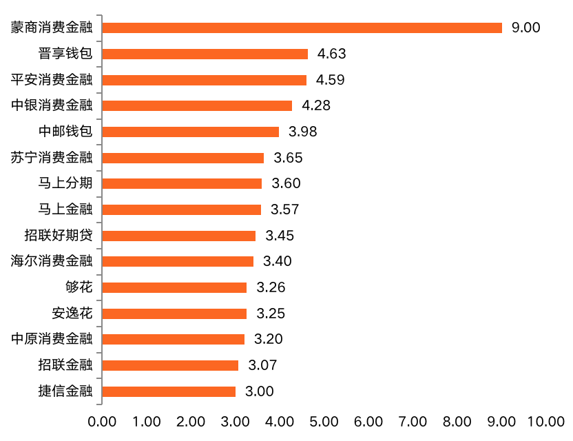 人均單日使用時長一定程度上可以反映用戶依賴程度。蒙商消費金融APP位列第一,得9分,優勢明顯;第二名至第四名均在4-5分之間浮動,5-15名在3-4分之間浮動。