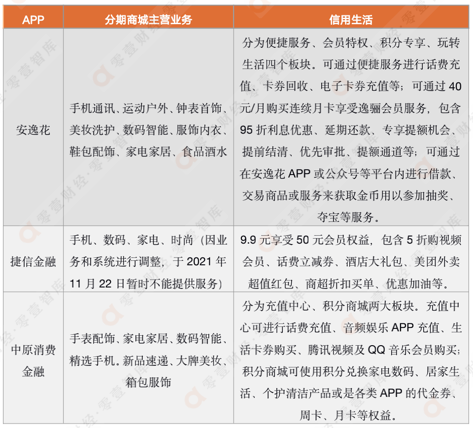 在分期商城方面,安逸花、捷信金融APP和中原消費金融APP的分期商城都有銷售手機、數碼、家電和服飾,安逸花APP中的產品種類更加齊全一些;捷信金融APP的分期商城因業務和系統進行調整,于2021年11月22日暫時不能提供服務。