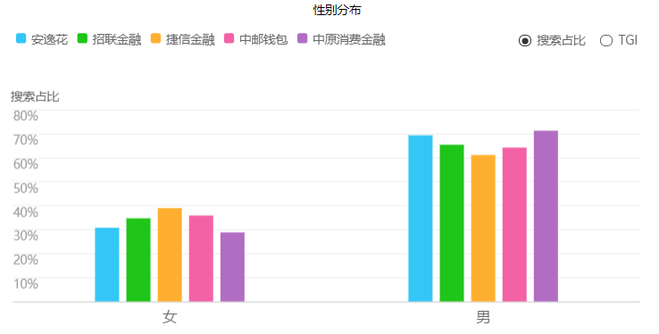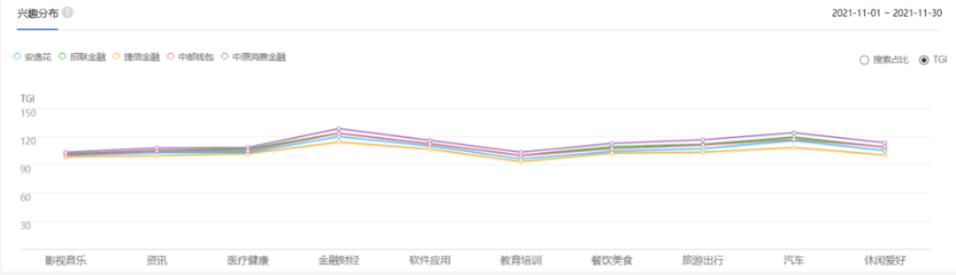 用戶畫像反映了關注消費金融APP的用戶的年齡、性別和興趣分布。根據百度指數總結的用戶畫像可以看出,無論從年齡分布,還是性別、興趣分布來看,整體五款 APP 的用戶偏好相近,較為同質化。
