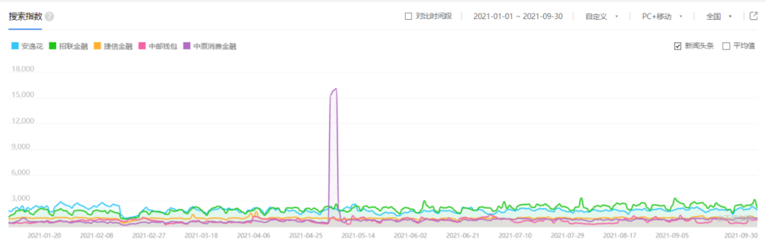 值得注意的是,中原消費金融APP搜索指數于今年5月大幅上漲,躍居第一,隨后回落。此前2021年2月底,中原消金在業內率先推出 “7天無理由還款”,引發熱議。