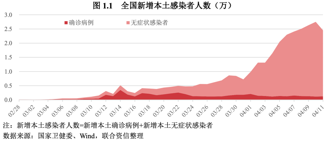 本輪疫情傳染速度更快,無癥狀感染者居多。自2020年初武漢爆發疫情以來兩年多的時間,全國各地散發性疫情多有反復,但規模都比較小,而且均在較短時間內得以控制,沒有對經濟造成較大負面影響。與之前的局部疫情不同,2022年3月以來的本輪疫情主流毒株為奧密克戎,傳染率高、隱匿性強,僅在3月1日至4月11日期間全國累計報告本土感染者就超過30萬例,其中新增無癥狀感染者明顯增多。