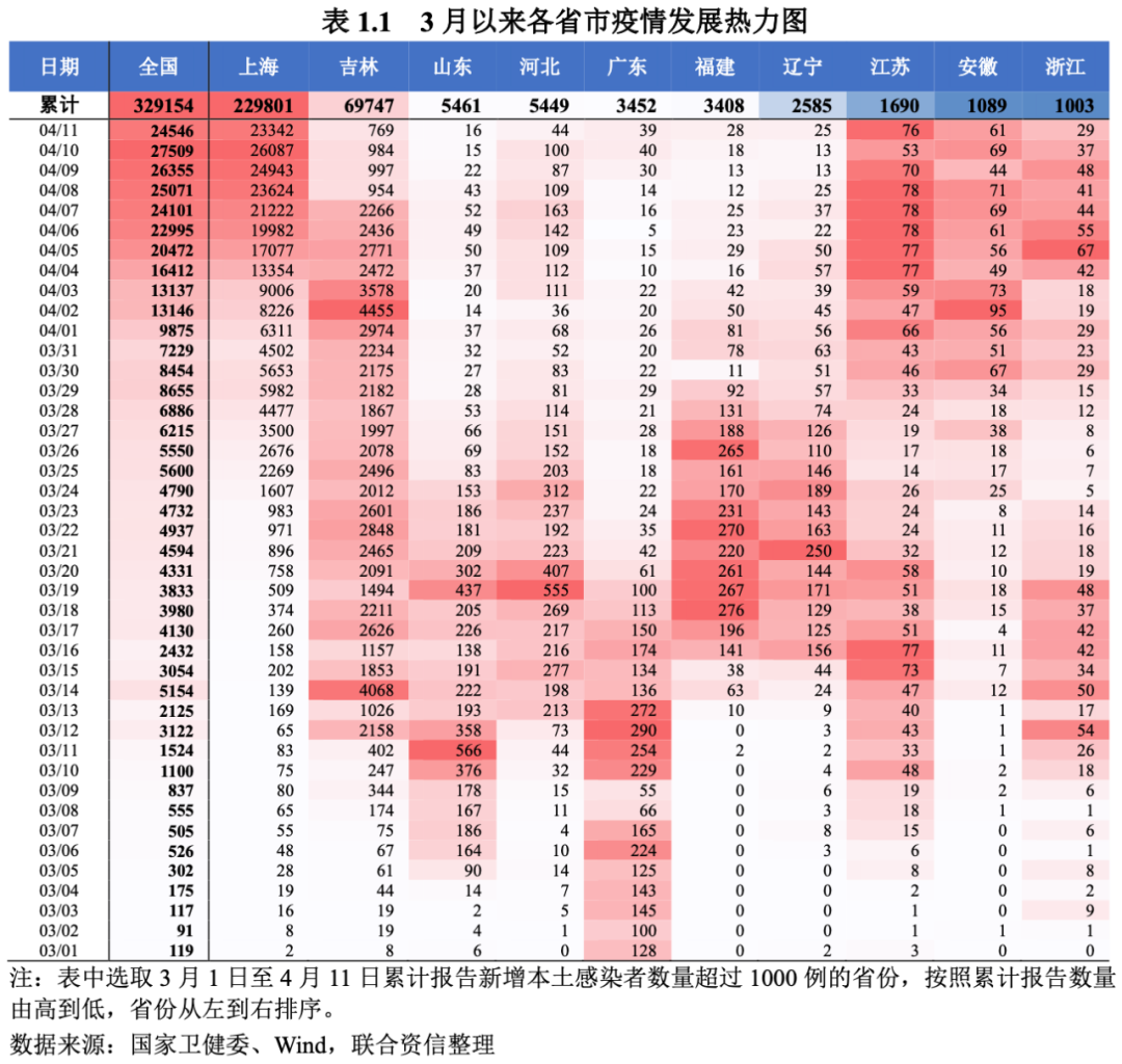 本輪疫情波及了全國大部分省市地區,影響范圍更廣。本輪疫情目前已經波及全國30個省市地區,近90%感染者來自于上海市和吉林省。其中,上海市3月1日至4月11日期間累計報告本土感染者超過30萬例,4月7日以來每天新增感染者超過2萬例,疫情尚未出現明顯拐點,防控形勢十分嚴峻。此外,上海疫情已經外溢到多省市,江蘇、浙江以及安徽近日以來新增感染者數量呈現上升態勢(見表1.1),上海周邊省市防控壓力明顯上升。吉林省3月1日至4月7日期間累計報告本土感染者超過6萬例,主要集中在長春市和吉林市,兩市2021年GDP占全省比重接近三分之二,對吉林省整體經濟的影響較大。前期疫情較為嚴重的深圳、山東,在實施嚴格的封閉式管理后,近期疫情已經趨于平緩,逐步恢復正常生產生活秩序。