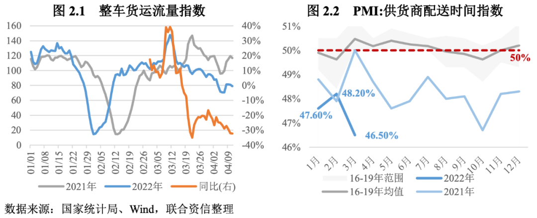 物流效率下降、供應鏈受到沖擊,企業生產經營承壓。3月以來,深圳、吉林、上海等地相繼采取封城措施,造成較大范圍停工停產。從高頻數據來看,3月下旬以來,整車貨運流量指數同比下降超過20%,物流效率明顯降低。PMI數據也顯示,3月供應商配送時間指數逆季節性跌至2020年3月以來的最低點,制造業供應鏈穩定性受到較大影響,物流運輸不暢,交貨周期延長,對企業生產形成拖累。