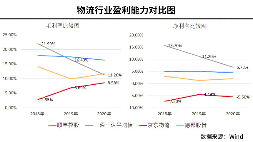 對比國內老對手順豐、菜鳥、四通一達等上市物流公司,京東物流近三年毛利率雖一直呈上漲趨勢,從2018年的2.85%增至2019年的6.89%,到了2020年,毛利率漲至8.6%,但還是僅處于行業腰部水準,低于中通、順豐等10%以上的毛利率。京東物流凈利率連續三年都處于掉隊狀態。