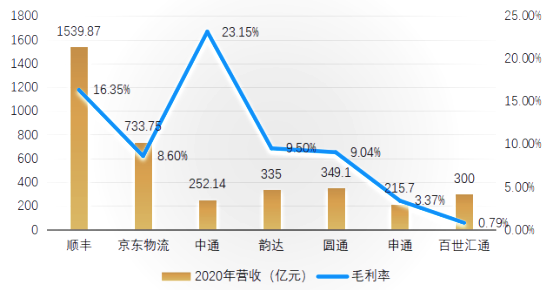 “其他客戶收入”指解決企業和個人客戶的“零散運輸需求”,和順豐、“三通一達”的物流服務業務是一個概念。其主要來源為兩部分:一是通過加盟制“京喜快遞”搶奪通達系的電商件市場;二是冷鏈物流業務。值得注意的是,跨越速運物流公司2020年8月并表后為京東物流貢獻了37.34億元收入。