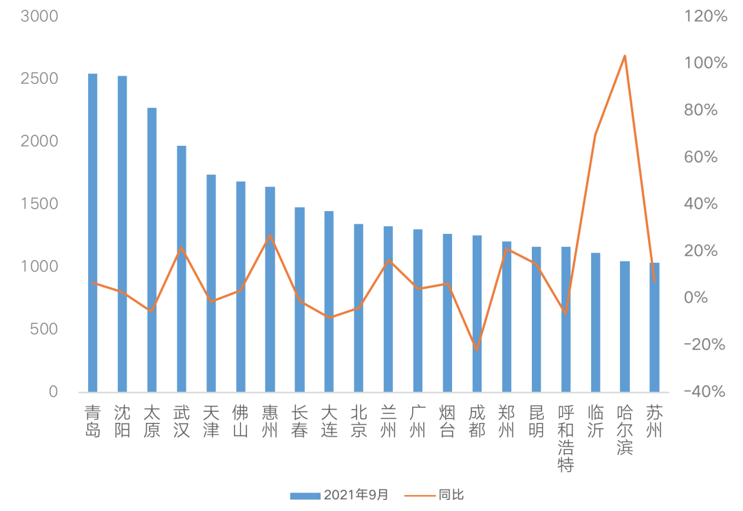 二線城市中,北部內(nèi)陸城市諸如沈陽、青島、太原9月末狹義庫存量均超2000萬平方米,位列本月末狹義庫存總量TOP3。同比來看,漲跌參半,漲幅超20%的主要是北部和中部等弱二線城市,鄭州、武漢、銀川、哈爾濱、南昌等,庫存積壓情況顯著。