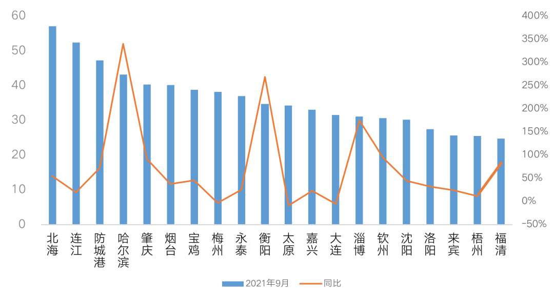 三四線城市由于供過于求加劇,成交下行致去化周期激增至17.53個(gè)月,高于百城平均。反觀下跌城市以東南沿海三四線為主,比如德清、鹽城等城市9月末消化周期維持在一年以下。而北海、連江、防城港、肇慶、煙臺(tái)、寶雞、永泰、衡陽、淄博等基本面缺乏支撐的三四線城市消化周期高達(dá)30個(gè)月以上,且同環(huán)比齊增,庫存風(fēng)險(xiǎn)依舊較大。