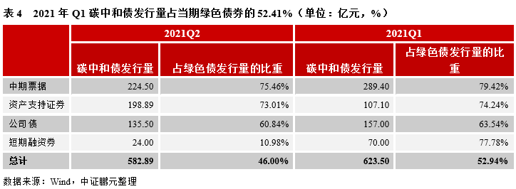 碳中和債角度,2021年Q2碳中和債發行量與Q1相比,有所下降。分債券品種看,碳中和資產支持證券發行規模有所增長,其余碳中和債券品種均有所下降。從碳中和債發行量占綠色債發行量的比重看,各品種碳中和貼標的積極性均有所下降,短期融資券碳中和貼標的積極性下降最明顯,或許是出于成本考慮,碳中和債券需要第三方機構的評估認證。