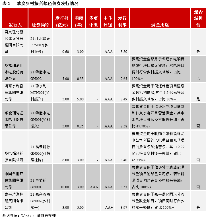 2021年3月以來,交易商協會、交易所相繼推出鄉村振興債券。2021年二季度發行的綠色債券有7只同時貼標鄉村振興債券。發行鄉村振興綠色債券,需要同時滿足鄉村振興認定和綠色認定,其中,鄉村振興債券的認定通過主承銷商盡職調查認定屬于鄉村振興類項目,參照的依據主要包括:2021年中央一號文件、國家鄉村振興局相關政策文件、發行人所在省市政府或鄉村振興主管部門政策文件。發行鄉村振興綠色債券,募集資金用途也需要同時滿足鄉村振興債和綠色債的要求,其中,鄉村振興債對募集資金用于鄉村振興項目的最低比例要求為30%。