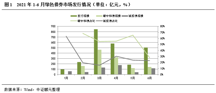 2021年上半年國內市場共發行綠色債券2,444.96億元,與去年下半年相比,環比增長113.94%,已超過去年全年綠色債券市場發行規模。上半年綠色債券發行集中在3月、4月和6月。作為今年綠色債券市場的最大亮點,上半年碳中和債共發行1,206.39億元,占綠色債券總體發行規模的49.34%,分月度來看,6月份碳中和債的貼標積極性有所減弱。