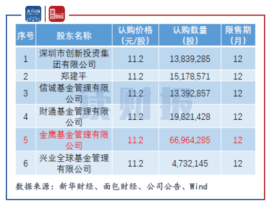 金鷹基金所持有的公司股份來自于2016年8月博威合金的定向增發。2016年初博威合金收購其控股股東博威集團有限公司的新能源資產——寧波康奈特,公司通過向金鷹基金、深圳市創新投資集團等6位投資人定向增發股票1.34億股,共募資金近15億元,主要用于支付收購寧波康奈特的現金價款以及償還寧波康奈特的銀行借款。通過此次定增金鷹基金共獲配6696.43萬股,獲配價格為11.2元/股,限售期為12個月。按照獲配價格計算,截至2021年11月29日收盤,金鷹基金目前所持股份浮盈10.55元/股,逾90%。