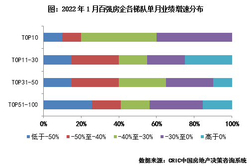 2022年1月,百強房企中多數(shù)規(guī)模房企銷售表現(xiàn)不佳,單月業(yè)績同比以及較去年月均水平變動都有明顯下降。具體來看,1月近9成百強房企單月業(yè)績同比降低,其中2成房企降幅在30%至40%之間,近4成房企降幅高于40%。龍頭房企中,萬科、恒大單月業(yè)績降幅明顯,分別達到53.1%和94.9%。1月,僅仁恒、華發(fā)、濱江、建業(yè)等少數(shù)企業(yè)實現(xiàn)了單月業(yè)績同比增長。