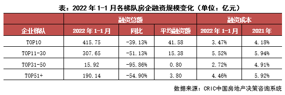 企業(yè)表現(xiàn):本月融資總量最高的企業(yè)為萬科地產(chǎn),融資總量約124.16億元,主要是發(fā)行了30億元的中期票據(jù),此外進行了資產(chǎn)證券化產(chǎn)品的發(fā)行。從企業(yè)梯隊來看,2022年1月TOP10房企融資平均額41.58億元最大,融資總額同比下降39.13%,下降幅度最小;TOP31-50房企融資額僅有15.92億元,該梯隊進行融資的企業(yè)相對較少。成本來看,TOP31-50梯隊的房企融資成本最低,為2.72%,其較2021年全年下降2.19pct,降幅最大;而TOP11-30的融資成本最高,為5.52%。