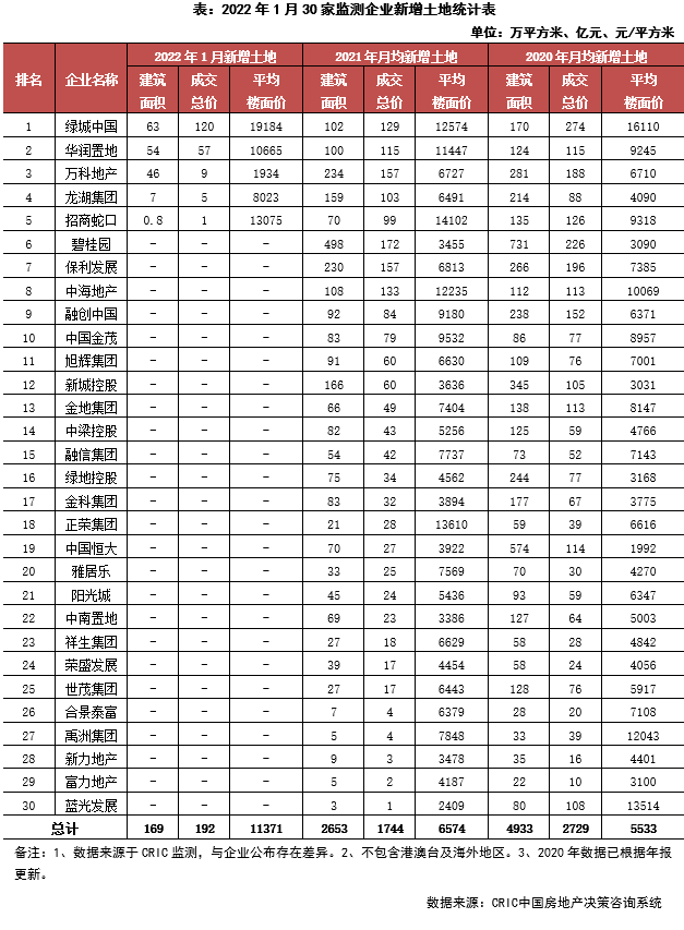 2022年開年首月,30家監(jiān)測房企土地投資處于低位,新增土地成交建面、總價相比2021年及2020年年均都有大幅收窄,受投資結構等影響,平均樓板價11371元/平方米。本月30家典型房企新增土儲總建面169萬平方米,環(huán)比下降87%;新增土地成交價格192億元,環(huán)比下降83%。平均樓板價11371元/平方米,與上月相比上升30%。主要由于投資量少且相對集中,拉高整體平均樓板價。