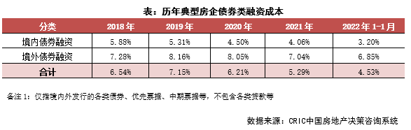 融資成本:2022年1月100家典型房企新增債券類1融資成本4.53%,較2021年全年下降下降0.76pct,其中境外債券融資成本達6.85%,下降0.19pct,境內(nèi)債券融資成本3.20%,下降0.87 pct。環(huán)比2021年12月來看,總融資成本環(huán)比上升0.01pct,境外融資成本環(huán)比下降0.16pct,境內(nèi)融資成本環(huán)比下降0.53pct。境內(nèi)發(fā)債的企業(yè)中,可以進行發(fā)債的企業(yè)成本相對較低,融資利率在2.50%-4.00%間,白名單企業(yè)繼續(xù)發(fā)揮融資優(yōu)勢,繼續(xù)發(fā)行利率較低的債券;境外發(fā)債成本方面,旭輝、遠洋等發(fā)行了綠色擔保票據(jù),其成本不超過5%,也相對較低,還有部分企業(yè)完成了境外債的交換要約和額外發(fā)行,成本相對較高。