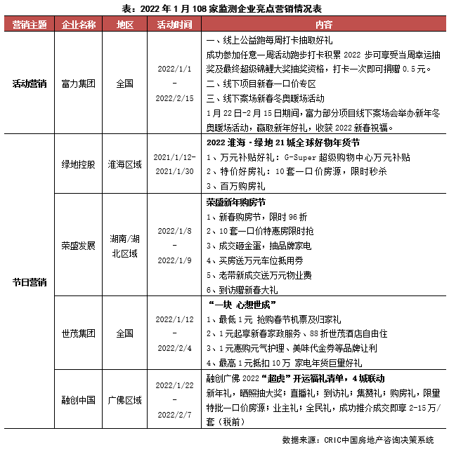新年伊始,房企營銷積極性并不高,主要依托元旦和春節(jié)展開節(jié)日營銷活動。從市場來看,1月市場堪稱冷淡,29個重點監(jiān)測城市商品住宅供應面積同、環(huán)比分別下降43%和58%,成交面積環(huán)比下降37%,同比跌幅擴至46%。從營銷來看,本月房企營銷積極性不高,少有房企推出集團性活動,區(qū)域聯(lián)動營銷也比較少,僅有世茂、綠地、融創(chuàng)、榮盛等房企推出了一些節(jié)日活動,自碧桂園21年底推出步數(shù)打卡,富力本月借助東奧契機亦推出“線上公益跑”打卡活動。