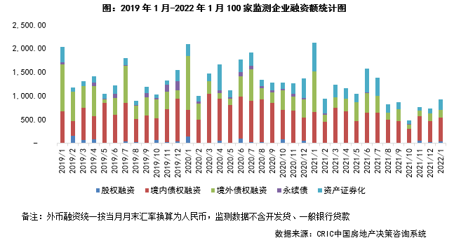 融資總量:2022年1月100家典型房企的融資總量為929.46億元,環(huán)比上升26%,同比下降56%。自2019年以來,每年年初房企融資量都相對較大,均超過2000億元,而本月融資量不足千億元,一方面在當前房企危機仍未全面解除的情況下,金融機構當前白名單企業(yè)相對較少,放款較為謹慎;另一方面,部分企業(yè)為緩解年初的償債壓力已提前償還部分債券,同時減少新增融資計劃,導致融資量同比下滑較大。從融資結構來看,境內(nèi)債權融資499.08億元,環(huán)比上升9.8%,同比下降24.6%;境外債權融資169.66億元,環(huán)比上升10.0%,同比下降80.1%;本月資產(chǎn)證券化有所回升,融資223.01億元,環(huán)比上升97.9%,同比下降63.0%。