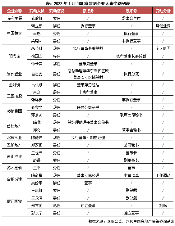 1月,房企高層人事動態(tài)信息數(shù)量較前一月有所減少,從108家監(jiān)測企業(yè)的人事變動情況來看,房企對組織架構的調(diào)整、管理層重組都有所減緩。
