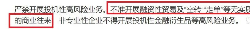 這并不是監(jiān)管及機(jī)構(gòu)第一次關(guān)注供應(yīng)鏈金融和商品貿(mào)易業(yè)務(wù)。2022年2月22日,石家莊市政府國(guó)資委印發(fā)《市國(guó)資委監(jiān)管企業(yè)投資經(jīng)營(yíng)“十個(gè)嚴(yán)禁”》,明確提出“不準(zhǔn)開展融資性貿(mào)易及“空轉(zhuǎn)”“走單”等無實(shí)質(zhì)性貿(mào)易業(yè)務(wù)的商業(yè)往來”。