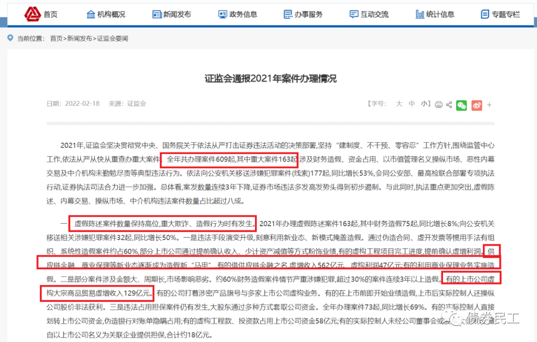 根據(jù)中國(guó)證監(jiān)會(huì)2022年2月18日發(fā)布的《證監(jiān)會(huì)通報(bào)2021年案件辦理情況》,虛假陳述案件中,供應(yīng)鏈金融、商業(yè)保理、大宗商品貿(mào)易等成為了造假的高發(fā)領(lǐng)域,某案件借供應(yīng)鏈融資之名虛增收入竟高達(dá)562億元!!!