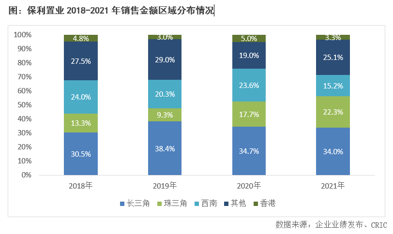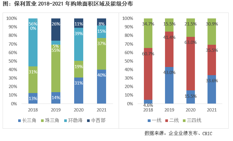 在城市能級(jí)方面,保利置業(yè)近兩年加大在三四線城市的布局,占比自2019年以來連年攀升,2021年占比達(dá)到30.9%,同比增長(zhǎng)9.4個(gè)百分點(diǎn),同時(shí)也加大在一線城市的布局,2021年一線城市的占比達(dá)到33.6%,同比上升18.1個(gè)百分點(diǎn)。而在區(qū)域布局方面,保利置業(yè)于長(zhǎng)三角和珠三角區(qū)域拿地的建面占比最高,分別達(dá)到40%和37%,占比分別同比增長(zhǎng)了9個(gè)百分點(diǎn)和18個(gè)百分點(diǎn)。
