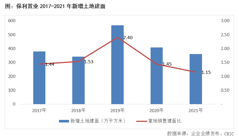 全年新增土地儲(chǔ)備建面360.9萬平方米,權(quán)益拿地總價(jià)230億元,新增拿地建面同比下降12%。值得注意的是,近兩年保利置業(yè)拿地均處于較高水平,根據(jù)拿地銷售建面比來看,自2017年以來新增土地建面高于銷售建面,2021年達(dá)到1.15。此外,為了保證規(guī)模和效益的增長(zhǎng),保利置業(yè)的拿地建面權(quán)益比由2019年的67%上升到近兩年的75%水平。