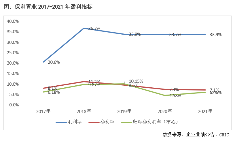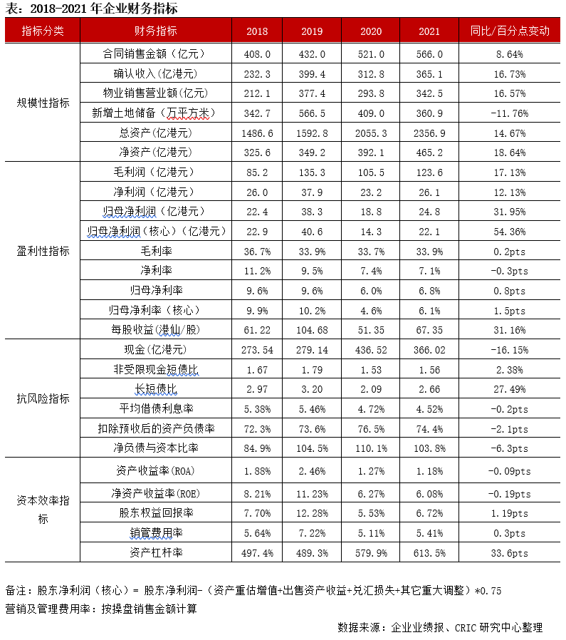 【營(yíng)收未恢復(fù)疫情前水平,凈利率仍有改善空間】2021年?duì)I業(yè)收入穩(wěn)步增長(zhǎng),同比增加16.73%至356.13億港元,仍低于2019年的水平。從內(nèi)地營(yíng)業(yè)收入來看,2021年保利置業(yè)內(nèi)地營(yíng)業(yè)收入同比增長(zhǎng)了12%,也較2019年的水平增長(zhǎng)了8%,內(nèi)地結(jié)轉(zhuǎn)得到穩(wěn)定增長(zhǎng)。凈利率7.1%,歸母核心凈利率6.1%,均低于行業(yè)平均,未來隨著低毛利率項(xiàng)目的逐步結(jié)轉(zhuǎn),其盈利率水平受到的壓力或?qū)⒏蟆?/p>