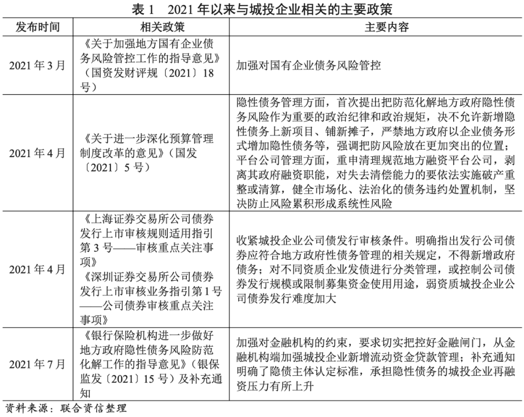2021年以來,國發(fā)〔2021〕5號文、滬深交易所公司債發(fā)行上市審核指引、銀保監(jiān)發(fā)〔2021〕15號文及補充通知等政策相繼出臺,對地方政府隱性債務(wù)保持高壓監(jiān)管態(tài)勢,城投企業(yè)融資政策整體收緊。