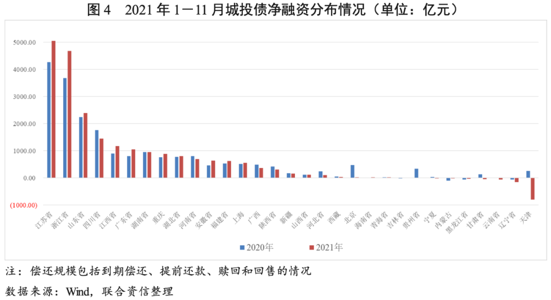 2021年1-11月,城投債償還規(guī)模同比擴大,城投債凈融資20813.57億元,較上年同期的20837.49億元基本持平,但凈融資增速同比大幅下降。