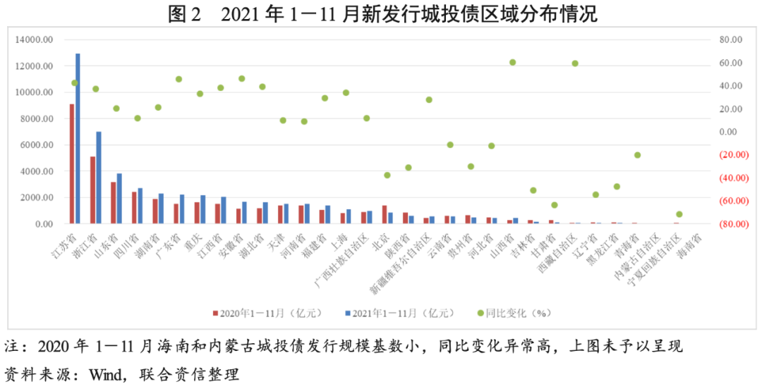 2021年以來,城投債發(fā)行規(guī)模保持增長但增速回落。城投債發(fā)行的區(qū)域性分化持續(xù),江蘇、浙江及山東等省份城投債發(fā)行規(guī)模保持較快增長,東北和西部省份城投債發(fā)行規(guī)模降幅明顯。受交易所收緊公司債審核條件影響,公司債發(fā)行增速明顯回落,規(guī)模占比有所下降。