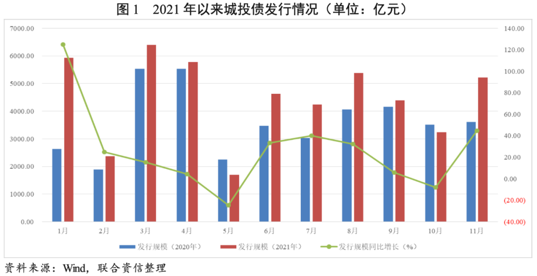 2021年以來,城投企業(yè)融資政策收緊,但市場流動性仍保持整體寬松,同時產(chǎn)業(yè)類債券尤其是房企債券信用風(fēng)險持續(xù)暴露,導(dǎo)致一級市場出現(xiàn)結(jié)構(gòu)性資產(chǎn)荒,綜合影響下,城投債發(fā)行規(guī)模持續(xù)增長。2021年1-11月,發(fā)行城投債的主體數(shù)量同比增長7.78%,城投債發(fā)行數(shù)量及發(fā)行規(guī)模同比分別增長34.17%和24.12%,仍保持增長態(tài)勢,但增速較上年同期(74.15%和67.84%)均明顯回落。具體來看,除5月份和10月份城投債發(fā)行規(guī)模小于上年同期外,其他月份均高于上年同期水平。國發(fā)〔2021〕5號文及交易所公司債審核指引于4月份集中發(fā)布,嚴監(jiān)管下5月份城投債發(fā)行規(guī)模較上年同期下降24.61%;10月份,房企債務(wù)違約影響持續(xù)發(fā)酵疊加節(jié)假日因素,城投債發(fā)行規(guī)模較上年同期下降8.02%。