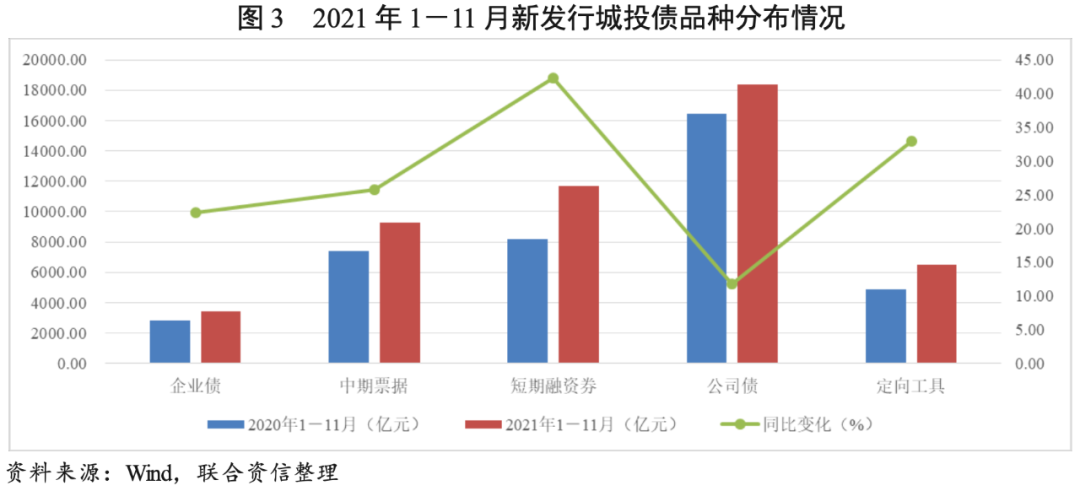 從發(fā)行品種來看,2021年1-11月,新發(fā)行城投債以公司債(占37.25%、)、短期融資券(占23.71%)和中期票據(jù)(占18.84%)為主,受滬深交易所收緊城投債發(fā)行審核條件影響,公司債發(fā)行規(guī)模占比較上年同期的41.36%下降4.11個百分點,發(fā)行規(guī)模增速由上年同期的117.91%大幅回落至11.79%。短期融資券發(fā)行規(guī)模較上年同期繼續(xù)保持較快增長,發(fā)行規(guī)模占比較上年同期的20.68%提升3.03個百分點,融資政策收緊引發(fā)市場對部分地區(qū)城投企業(yè)償債能力擔(dān)憂,風(fēng)險偏好有所下降,對短期限產(chǎn)品更為青睞。
