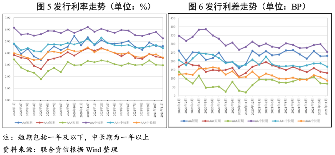 2021年以來,債券市場資金面表現(xiàn)為“先邊際收緊后逐步放松”。具體來看,2021年上半年,隨著國內(nèi)疫情形勢趨于穩(wěn)定,經(jīng)濟穩(wěn)步復(fù)蘇,債券市場資金面延續(xù)了2020年下半年以來邊際收緊的趨勢;2021年下半年,隨著央行全面降準以及下調(diào)金融機構(gòu)存款準備金率等釋放流動性,市場資金面趨緊態(tài)勢有所回暖。受市場流動性變化的綜合影響,2021年1-11月,不同期限債券的發(fā)行利率和發(fā)行利差走勢呈現(xiàn)分化,短期城投債的發(fā)行利率和發(fā)行利差較2020年均有所上升,中長期城投債的發(fā)行利率變化不大、發(fā)行利差均有所下降。不同地區(qū)城投債發(fā)行利差分化較為明顯。